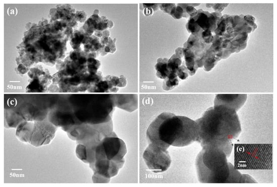 TEM images of Mg2MnO4 nanoparticles annealed at different temperatures: (a) 500 °C, (b) 600 °C, (c) 700 °C, (d) 800 °C, (e) HR-TEM image marked in (d).