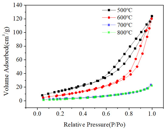 The N2 adsorption/desorption isotherms of Mg2MnO4 at different annealing temperatures.