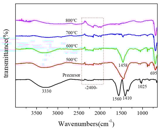 The IR spectra of the sintered samples are presented in Figure 6. From the spectrum of the precursor (Figure 6), we could see that there were several intense absorption peaks: the absorption peak at 1450–1700 cm−1 was caused by the deformation and vibration of water, the wide absorption peak at 3400 cm−1 was due to the stretching vibration of lattice -OH, and the asymmetric stretching of CO2 appeared at 2400 cm−1 [18]. When the sample was annealed at 500 °C, an obvious absorption peak at 695 cm−1 appeared in the IR spectra, and the new peak was the characteristic absorption peak of Mg2MnO4. When the heat treatment temperature of the sample was increased to 600 °C, the peak at 695 cm−1 was enhanced, indicating the crystallization was strengthened. The result was consistent with the XRD analysis.