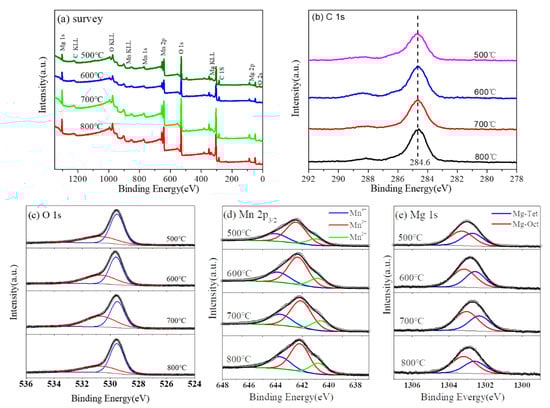 The survey XPS spectra of Mg2MnO4 samples annealed under different temperatures were determined and shown in Figure 7a. The results showed that no other elements were detected except for the original components and contaminated carbon. The C 1 s peak of the carbon contamination at 284.6 eV was used as reference (Figure 7b). The O 1 s spectra (Figure 7c) could be deconvoluted into two peaks. The peak located at the high-binding energy side (530.6 eV) was mainly from the adsorbed oxygen, while the peak with the low-binding energy (529.6) was allocated to the metal-oxygen bond corresponding to the lattice oxygen [19]. In order to analyze the chemical environments and valence states of Mn and Mg ions, Mn 2p3/2 and Mg 1 s high-resolution photoelectron spectra were measured, and the results are shown in Figure 7d,e, respectively.