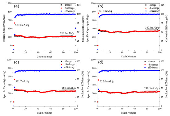 The curves of the charge–discharge performance of the Mg2MnO4 samples annealed at different temperatures are shown in Figure 8. All the samples showed good cycle stability, and the coulombic efficiency was near 100%. The first discharge capacities were 537.0, 771.5, 531.7, and 522 mAh/g for the samples annealed at 500–800 °C. The capacity was higher than the commercial graphite anode materials, for which the theoretical specific capacity was 372 mAh/g [30]. It can be seen from Figure 8 that the capacities increased with the temperature increasing from 500 °C to 600 °C, and then decreased when the temperature was higher than 700 °C. This change could be explained in combination with the particle size and microstructure of the samples. From the above analysis, we knew that the samples annealed at 500–600 °C had a small crystallite size (30–50 nm), which was helpful for the electrochemical properties. From the view of microstructure, the sample annealed at 600 °C had a relatively small inversion degree when compared with the 500-heated sample. The previous studies indicated that the spinel materials with less inversion degree showed better electrochemical performance [31,32]. Therefore, the 600-heated sample displayed the higher capacity. However, the crystal particle of the sample grew rapidly when annealed at 700–800 °C, and the size was more than 100 nm; thus, the specific surface area decreased greatly. Although the inversion degree of the samples decreased with increasing annealing temperature, the large crystallite particle was not conducive to the migration of lithium ions in the material, so the discharge capacity of the sample annealed at these two temperatures decreased. After 100 cycles, the sample annealed at 600 °C remained the largest capacity of 340.0 mAh/g, and all the samples showed almost no decay in the capacities; the cycle stability of Mg2MnO4 was better than that of the MgCo2O4 spinel [33]. As a result, the sample annealed at 600 °C as lithium battery anode material had a good electrochemical performance and showed a highest charge–discharge capacity.