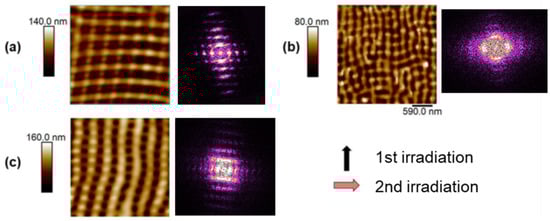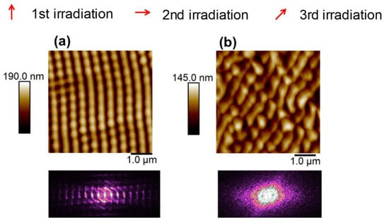 It can be seen in Figure 3 that with an equal number of pulses in both irradiation steps, the second polarization direction determines the main direction of the LIPSS. Even with a shorter number of pulses during the second irradiation step (Figure 3c–d), LIPSS are clearly better formed in the direction of the second polarization vector, although FFT patterns indicate that some ordering due to the first irradiation is still present, buried by more perfect LIPSS that appear parallel to the polarization of the second irradiation. Irradiating with 3300 pulses in the vertical direction followed by 300 pulses in the horizontal direction, LIPSS show good order in both directions (Figure 3d), as can be seen in the FFT image, which shows the intensity maxima along both orthogonal directions.