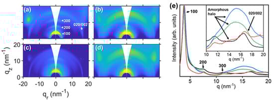 GIWAXS patterns from Figure 5 show typical P3HT diffraction pattern with preferential “edge-on” orientation, with {h00} reflections oriented along the qz axis. The 020/002 reflection and the halo from the amorphous domains are located around q = 17 nm−1. It can be seen that GIWAXS patterns from irradiated samples (Figure 5b–d) present a broad amorphous halo, compared with the pattern from non-irradiated P3HT (Figure 5a).