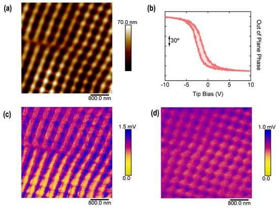 AFM height (a) and PFM results (b–d) of a patterned functional polymer surface exhibiting ferroelectricity. (b) Hysteresis of the out-of-plane PFM phase as a function of a DC bias applied to the conducting AFM tip. (c) Out-of-plane amplitude mapping of the patterned surface. (d) In-plane amplitude mapping of the patterned surface.