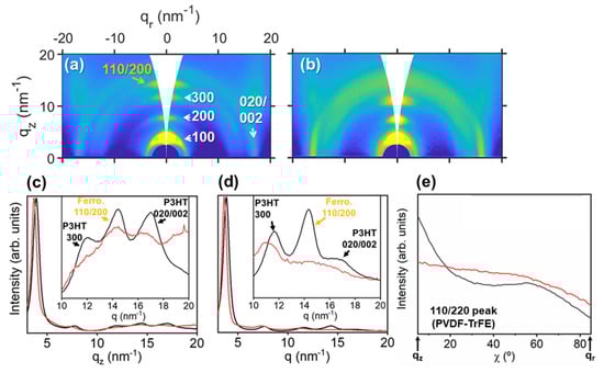 Figure 8a shows the reflection associated with the (110/200) planes of the ferroelectric phase of P(VDF-TrFE) highly oriented in the qz axis, whereas the GIWAXS pattern from the irradiated bilayer does not show this orientation (Figure 8b). In Figure 8c, it can be seen that the (110/200) reflections from P(VDF-TrFE) along the qz axis is clearly detected in the profile from non-irradiated bilayer (black curve) and it is slightly detected in the profile from the irradiated bilayer (red curve). Looking at Figure 8d, the peak from P(VDF-TrFE) is highly reduced between the profile from the non-irradiated (black curve) and the irradiated bilayer (red curve). Therefore, there is a clear loss of crystallinity in P(VDF-TrFE) when it is irradiated, as well as in irradiated P3HT (Figure 5). However, since PFM results (Figure 7) show piezoelectric behavior, it is supposed that the irradiated P(VDF-TrFE) in the bilayer keeps some degree of crystallinity. Radial integration in the q-range of the (110/002) reflection of P(VDF-TrFE) (Figure 8e) reveals indeed a complete disorientation of a crystalline order that was originally highly oriented in the out-of-plane axis, corresponding with the azimuthal angle χ = 90°, as can be seen in Figure 8a. Therefore, the crystallinity of irradiated P(VDF-TrFE) is not completely removed, but it loses the original preferential orientation that it presents in the non-irradiated bilayer.