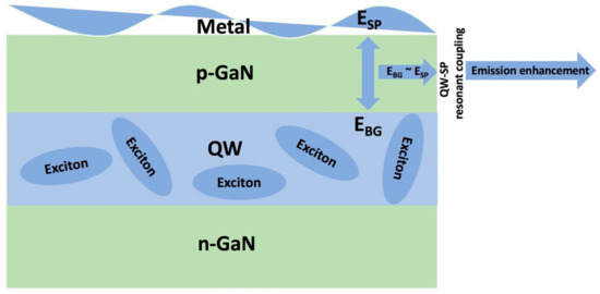 The nitride-based QW-LEDs are fabricated by sandwiching a QW layer between p and n-type GaN layers. AlGaN or InGaN can be used as QW materials for the development of nitride-based LEDs depending on their applications in the UV or visible ranges. The QWs contain excitons that can decay both radiatively and non-radiatively. The radiative recombination that is the desirable property of a QW in an LED, can be enhanced by SP–QW coupling. The exciton–SP coupling can be achieved by using metal films, NPs, or gratings in the vicinity of QWs that can enhance the emission efficiency of an LED. The SPs of high momentum lose their energies through scattering and couple to radiated light, resulting in efficient SP–QW coupling [25]. The strong SP–QW coupling is achieved when the QW emission energy is close to the SP resonance wavelength of the metal nanostructures. Such an alignment of the SP resonance wavelength and QW emission wavelength results in increased spontaneous emission. K. Okamoto et al. explained the phenomenon by using a schematic diagram similar to the one shown in Figure 1 [26]. They proposed that the excitons are formed in QWs as a result of photo or electrical pumping. The radiative recombination in such devices can be enhanced by using a metal layer in the near-field of QWs that results in a fluctuating electric field. The high density of states of SPs in metal produces high electromagnetic fields. The spontaneous emission in QWs increases with the local density of states and the strength of the electromagnetic field of SPs, known as the Purcell effect [27]. The Purcell effect is associated with the change in carrier lifetime in the presence of SPs in LEDs. When the bandgap energy (EBG) of the QW layer is in close resonance with the vibration energy (ESP) of the fluctuating electric field of the SPs on the metal interface, the QW energy efficiently transfers to the SPs, known as SP–QW coupling. Strong SP–QW coupling can be achieved by controlling the geometry of NPs that in turn gives control over the ESP [28,29]. The rate of exciton recombination increases with the rate of SP–QW coupling. The exciton–SP coupling process is faster than radiative and non-radiative processes in an LED due to the large density of states of SP modes. The increased density of states of SPs results in a fast decay rate due to the increased overlap of electron and hole wave functions [30].