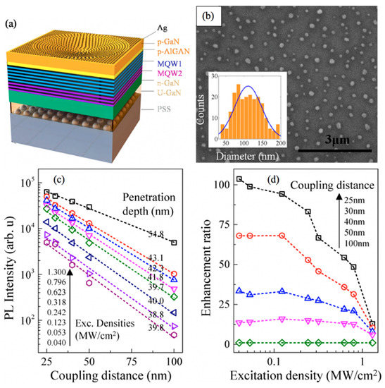 Y. Li et al. reported the SP enhancement in dual-wavelength pseudo-micro blue LEDs that contained a microcave array of large aspect ratio on the p-GaN capping layer, as shown in Figure 2a [74]. The devices were fabricated on patterned sapphire substrates (PSS). AgNPs were formed in the microcave array patterned in p-GaN for SP–QW coupling, as shown in the SEM image in Figure 2b. They measured PL by using different laser power densities for devices with different coupling distances between p-GaN and AgNPs. The PL intensities and enhancement ratios dropped for increased coupling distances, as shown in Figure 2c,d. They observed an increase in penetration depths of the SP field in p-GaN with the increase in laser power densities but the enhancement ratios dropped because of the saturation of the density of states of SPs. The penetration depths varied between 39–55 nm for various excitation densities. They concluded that high excitation densities and shorter coupling distances (~25 nm) were suitable for PL enhancement.