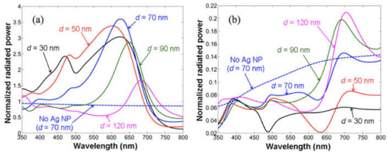 In their study, the IQE of SP-enhanced blue SQW-LEDs dropped to an even smaller value than that of the intrinsic IQE for a coupling distance of ~100 nm. It indicates that the PL quenching phenomenon occurred instead of enhancement. The results were explained in terms of a redshift in the wavelength of the diminishing radiated power leaving a window in the original enhancement range proposed by Y. Kuo et al. [76]. They used the commercial COMSOL software to study the light emission and extraction in the presence of a radiating dipole coupled with the SP mode of an AgNP on GaN. The estimated upward and downward radiated powers are shown in Figure 3a,b, where the shift in downward radiated powers is more dramatic and strongly dependent on GaN thickness. For the enhanced SP–QW coupling, the radiated powers should lie in the emission wavelength range of the QWs. It otherwise results in a PL quenching phenomenon instead of enhancement. It should be noted that the redshift of radiated powers can suppress the IQE in blue LEDs and support the IQE in green LEDs. The upward radiated powers were high only in the wavelength ranges 600 nm and above. The results indicate that the downward radiated powers mainly define and support the SP–QW coupling. It is usually assumed that the SP resonance wavelength of a particular metal nanostructure geometry defines the SP–QW coupling strength. However, from this work, we conclude that the p-GaN thickness also plays an important role in the PL enhancement and quenching phenomena.