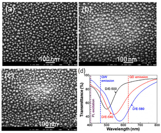 C. H. Lin et al. experimentally demonstrated the shift in SP resonance wavelength by annealing the Ag films of varying thicknesses at different temperatures [12]. The purpose was to tune the SP resonance wavelength to achieve resonance with emission wavelengths of QW and quantum dots (QDs) used in their studies. The AgNPs’ sizes were found to increase slightly with Ag film thickness, as shown in Figure 5a–c. They observed a clear redshift in the position of SP resonance wavelength with the increase in AgNP size, as shown in Figure 5d. Three AgNP samples gave broad SP resonance wavelengths centered at 500, 540, and 580 nm. Since the AgNPs of random sizes and periodicity were fabricated, NPs of certain sizes and periodicity might result in sharp SP resonance wavelengths only covering a small wavelength range.