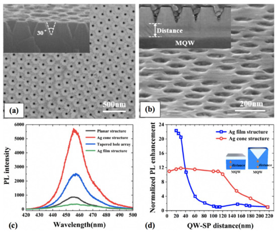 For blue GaN-based LEDs, the coupling distance less than 42 nm has been reported to be appropriate for effective SP–QW coupling when using Ag metal that is far less than the GaN thickness required (>70 nm) to achieve reasonable electrical performance [10,81,82]. However, proper engineering of the metal nanostructures can allow SP–QW coupling through thick p-GaN layers. Recently, Xuzheng Wang et al. have demonstrated that a tapered Ag array structure on a heavily textured p-GaN layer resulted in an increased coupling efficiency for coupling distance far beyond the penetration depth of a blue LED [83]. The SEM surface images of the patterned surface are shown in Figure 6a,b. They explained that the metal conical tip accumulates the SP energy and the corrugated surface provides the missing momentum in such a structure. The structure resulted in a 16-fold increase in electroluminescence intensity compared with a planar LED for 100 nm coupling distance. The work was inspired by the previous studies on tapered waveguides which conclude that the giant electric fields can be produced using accumulated SP energy at metal conical tips that have much slower distance-dependent decay rates [84,85]. The tapered hole array structures with Ag showed the highest PL enhancement as the high density of states at the metal tip provided strong LSP energy even at distances as large as 100 nm, as shown in Figure 6c. The results are promising to avoid the short coupling distance requirement for blue LEDs by designing the Ag nanostructures. Figure 6d shows the distance dependence of normalized PL for a planar Ag LED structure compared with a tapered Ag structure. Interestingly, the Ag cone structure gave lower PL enhancement for distances ≤ 40 nm compared with the planar Ag film structure. This indicates that the PL quenching phenomenon occurred when the metal cone structure was at shorter distances from QW. The coupling efficiency of the Ag cone structure remained almost constant for distances up to 100 nm and dropped afterward, compared with the Ag film structure, which showed PL enhancement efficiency only for thicknesses up to 40 nm, far less than the required GaN thickness to ensure high electrical performance. The tapered Ag cone structure resulted in enhanced EL intensities, but the threshold voltage was slightly higher. Although the structure seems promising for a relatively thick p-GaN layer for practical blue LED application, the high cost of lithography and design complications are serious limitations for such structures.
