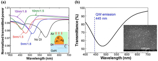 (a) Simulated normalized transmission spectra of an AgNP with various DI conditions, including the case of no DI and the cases of DI thicknesses at 5 and 10 nm and refractive indices at 1.5 and 1.8. The insert shows the geometry of simulation, including the definitions of parameters a, b, and t. Reproduced with permission from [52]. Copyright 2014 AIP Publishing. (b) Transmission spectrum of the AgNPs on a GaZnO/u-GaN template. The vertical dashed line indicates the QW emission wavelength at 445 nm. The inset shows the SEM image of the surface AgNPs fabricated on the GaZnO layer. Reprinted with permission from [16]. Copyright 2018 The Optical Society.