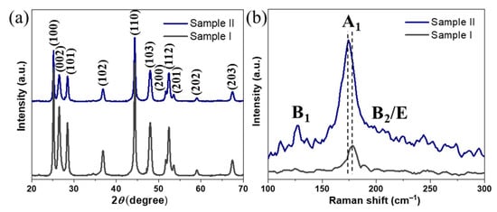 XRD patterns (ICDD card no. 01–078-5190) (a) and Raman spectra (b) of the synthesized nanoparticles from both samples.