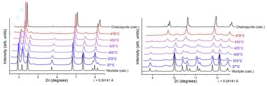 In-situ variable temperature synchrotron powder XRD of wurtzite CuInSe2 NPs sample (λ = 0.24141 Å). The sample was heated from room temperature (bottom pattern) to 478 °C (top pattern).