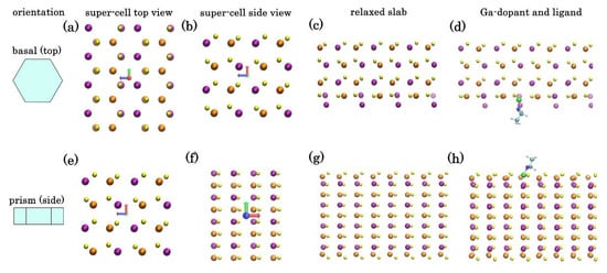 Ordered CIS orthorhombic model of the top or basal (a–d) and side or prism (e–h) surfaces of hexagonal nanoparticle: idealized super-cell top view (a,e) and side view (b,f) and density functional theory (DFT) relaxed atomic structures of the pure surface slabs (c,g) and with Ga dopant and -NH-C2H5 passivating group (d,h). Legend: In (purple), Cu (orange), Se (yellow), Ga (green), N (deep blue), C (light blue), and H (white).