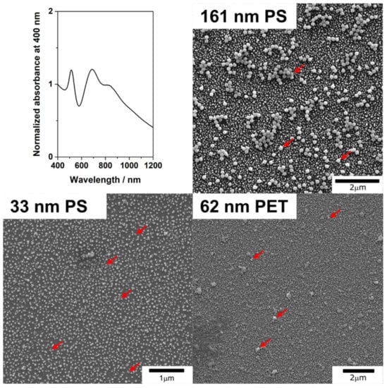 UV-vis extinction spectra of the 46 nm AuNP substrates and representative SEM images of the 161 nm PS, 33 nm PS, and 62 nm PET particles after their addition on top of the substrates. These images were taken at the middle of the cast drop and show that the gold and plastic particles are distributed homogenously throughout the substrate surface. Several examples of plastic particles are indicated with red arrows for clarity. See Figure A3 for additional SEM pictures.