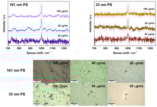 The 161 nm PS and 33 nm PS samples on 46 nm (Figure 2) and 14 nm (Figure A5) AuNP substrates could be detected down to 20 µg/mL in the center of the cast droplet. Additionally, 161 nm PS could be detected at 10 µg/mL in areas of higher particle concentration (e.g., drop edge, particle aggregates or drying clusters) on the 46 nm AuNP substrates (Figure A6). During these measurements, substrates created using 14 nm AuNPs were shown to have weaker signal than those created using 46 nm AuNPs. Despite the lower enhancements, signal could still be detected on 14 nm AuNP substrates for both sizes of PS particles down to 20 µg/mL (Figure A5). It is important to note that signal for 33 nm PS particles on the 14 nm substrates was found only in regions with high concentration of PS particles (Figure A5). On the 14 nm AuNP substrates, it was not possible to detect 10 µg/mL of plastic particles even at areas of higher particle buildup. For all PS particles, the primary peak of interest used for their detection is present at 1002 cm−1 and at the higher sample concentrations (e.g., 100 µg/mL and 40 µg/mL of 161 nm PS), a weak peak at 1032 cm−1 can also be observed (Figure 2). Such findings are in good agreement with Raman control data (Figure A4) and findings reported in the literature [,].
