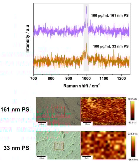 Representative SERS spectra obtained through automated mapping for 100 µg/mL samples of 161 nm PS particles on 46 nm AuNP substrates and samples of 100 µg/mL of 33 nm PS nanoparticles on 46 nm AuNP substrates. Laser power, scan speeds, and number of averaged accumulations for the samples can be viewed in Table A1. Spectrum obtained are shown above images of the intensity maps for the PS peak at 1002 cm−1 and the regions of interest (ROIs) the measurement was obtained from. Spectra come from regions of high intensity for the peak at 1002 cm−1.