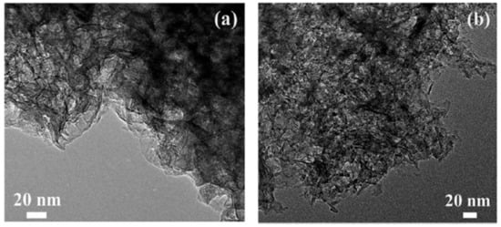 Transmission electron microscopy (TEM, JEM-2100F electron microscope, JEOL Ltd., Tokyo, Japan) images of (a) MgAl-LDH and (b) MgAl-MMO (adapted from [59] with permission with Royal Society of Chemistry, 2016).