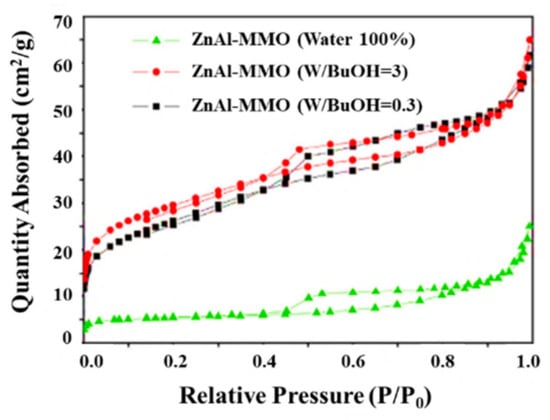 Meanwhile, researchers attempted to obtain high specific surface area in ZnAl-MMO by adopting unique solvents during the synthesis process or introducing interlayer anions other than carbonate. Huang et al. [70] synthesized ZnAl-LDH under water/n-BuOH mixed solvent condition where the water/n-BuOH ratio was controlled 0.3 and 3, respectively. As shown in the N2 adsorption-desorption isotherms (ASAP 2460 instruments, Micromeritics Instruments Corporation, Norcross, GA, USA), the ZnAl-LDH prepared under mixed solvent resulted in MMOs with higher nitrogen adsorption (Figure 6).