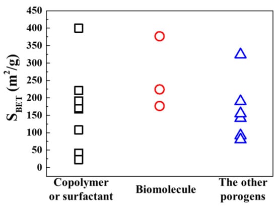 The reported SBET value of porous MMO prepared by the porogen-LDH. Porogen: micelle forming copolymer or surfactants (open square), biomolecules (open circle), the other porogens (open triangle).