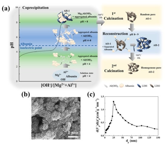 (a) Schematic diagram to produce MMOs from either coprecipitated albumin-LDH or reconstructed albumin-LDH. (b) SEM image (obtained by FEI QUANTA 250 FEG, Hillsboro, OR, USA) and (c) pore size distribution of MMO obtained from reconstructed albumin-LDH (obtained by BELSORP-mini Ⅱ, Microtrac BEL, Inc., Japan) (adapted with the permission from Jung et al. [48]. Copyright MDPI).