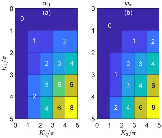 In the remaining part of this section, based on the evaluation of invariants and in Equations (33) and (34), we present topological phase diagrams of the 2D on-resonance double-kicked lattice for two typical situations. In the first case, we show the phase diagram of the system with respect to the kicking strengths in Figure 1. We observe that with the increase of these kicking strengths, a series of topological phase transitions can be induced, which each of them being accompanied by the quantized jump of or . At large values of , we further obtain rich Floquet HOTPs characterized by large values of . It is not hard to verify that there is no upper bound for the values of these invariants if the kicking strengths keep increasing. Therefore, the 2D on-resonance double-kicked lattice serves as a good candidate to generate Floquet second-order topological phases in momentum space with arbitrarily large topological invariants. Besides, according to the tensor product structure of Floquet operator in Equation (16), the boundaries separating different Floquet HOTPs are determined by the gapless conditions along one dimension of the lattice. More explicitly, these phase boundaries are determined by the conditions and , or equivalently