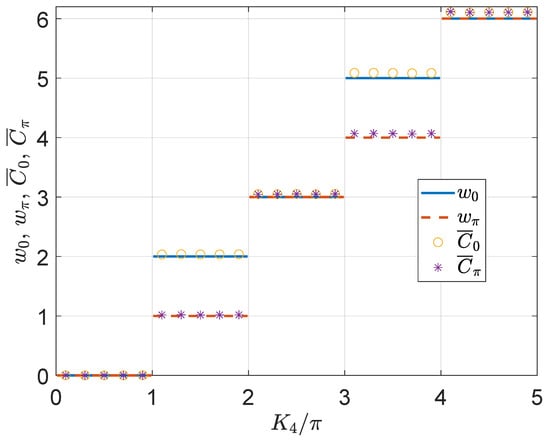 To verify the relations between the time-averaged mean chiral displacements and the topological invariants of the 2D on-resonance double-kicked lattice, we compute and compare and for a typical case in the remaining part of this section. In Figure 3, we present the topological invariants and mean chiral displacements with respect to the kicking strength for evolutions over driving periods. We observe that the time-averaged mean chiral displacements indeed take nearly quantized values in each Floquet HOTPs of the 2D on-resonance double-kicked lattice, which demonstrate the relation between them and the topological invariants of the system, i.e., (see Appendix C for derivation details of this relation). Besides, the values of also possess quantized jumps around all topological phase transition points ( in Figure 3). Therefore, the mean chiral displacements could also serve as a dynamical prob to the phase transitions between different Floquet HOTPs. The deviations of from quantization are due to finite-time effects, which will gradually go to zero with the increase of the number of driving periods t. Numerically, we checked that the time-averaged mean chiral displacements remain close to quantization for driving periods, which should be within reach in current or near-term experiments in photonic [126,127] and cold atom [128,129] systems.
