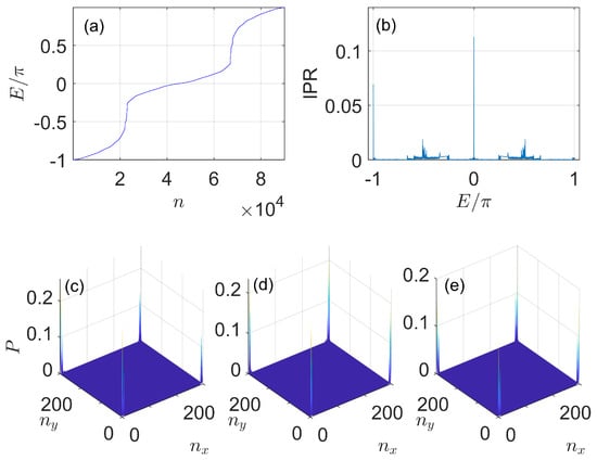 In Figure 5, we present the quasienergy spectrum, inverse participation ratio and corner modes of the system for a typical situation. In Figure 5a, we observe that the Floquet spectrum E spread throughout the first quasienergy Brillouin zone, and no gaps can be observed around . However, in Figure 5b, we find three clear peaks in the inverse participation ratio versus the quasienergy E around and , which indicates the existence of localized bound states in the system at these quasienergies. By investigating the data, we obtain eight (four) such bound states at (), with their probability distributions shown explicitly in Figure 5d,e [Figure 5c]. We see that all of these bound states are indeed localized around the corners of the system, and their numbers are determined precisely by the bulk-corner correspondence relation in Equation (41) for the given set of system parameters. Therefore, these corner states originate from the higher-order topology of our system. They represent topologically degenerate corner modes in momentum space of the system, which are protected by the chiral symmetry . Besides, these corner modes coexist with extended bulk states at the same quasienergies. We therefore refer to them as corner-localized Floquet topological bound states in continuum, in the sense that they do not hybridize with the surrounding bulk states even without a bulk band gap. This observation also extends the scope of bulk-corner correspondence of Floquet HOTPs to more general situations, in which the symmetry-protected corner modes can not only be found in spectral gaps, but also appear within topological Floquet bands. Note in passing that the corner-localized bound states in continuum with zero energy have been discovered before in static HOTPs [130,131,132]. By contrast, the corner-localized Floquet bound states in continuum subject to different topological characterizations, and the corner bound states in continuum with quasienergy are unique to Floquet HOTPs found in this work. Experimentally, the implementation of open boundary conditions might be achieved in Bose–Einstein condensates by a setup similar to the one employed in the realization of topological quantum walk in momentum space [129]. Meanwhile, by applying the mapping introduced in [121] from momentum to position space lattices, the 2D on-resonance double-kicked lattice may also be realized in real space, and the corner modes may then be probed in setups such as photonic waveguide arrays [132].
