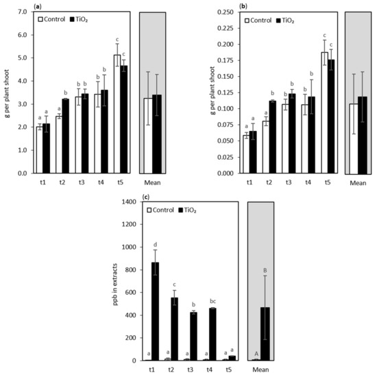 Fresh weight (a), dry weight (b), and Ti content (c) of oakleaf lettuce seedlings treated with TiO2-NPs applied on the leaves as a 0.75% suspension, while control plants were sprayed with deionized water. Plants were sampled 4, 7, 9, 11, and 13 days after treatment (sampling time: t1, …, t5, respectively). Lower-case letters above bars highlight significant differences for interaction effects, and capital letters indicate differences between the means for the treatment groups (NPs treated plants and control plants), according to Fisher’s test (p ≤ 0.05). Missing letters indicate no significant differences. Error bars represent standard deviations (±SD).