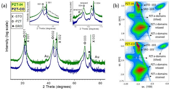 TEM images are presented in Figure 2, together with selected area electron diffraction (SAED) patterns. grown from the in-house manufactured target (PZT-IH). One can see that the epitaxial quality was very similar, and the crystalline structure was tetragonal in both cases, with some amount of a–c domains. The presence of a–c domains was possible due to the thickness of the layers: about 170 nm for PZT-IH, and about 150 nm for PZT-CO. At these thicknesses, the films could relax [,] with formation of a domains, as revealed by the XRD–RSM measurements.
