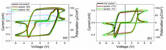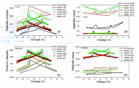 Electrical measurements were further performed. The obtained results are comparatively presented in Figure 4, Figure 5, Figure 6 and Figure 7. All the measurements were performed in three situations: on virgin contact; samples pre-poled with a negative voltage applied on the top contact at room temperature, leading to an initial upward polarization state; and samples pre-poled with a positive voltage applied on the top contact at room temperature, leading to an initial downward polarization state.