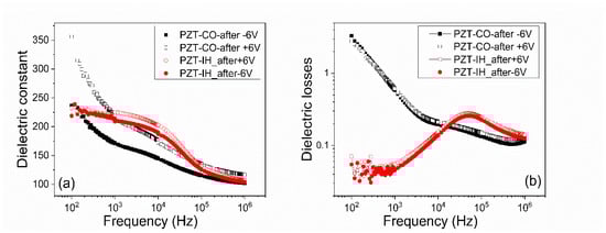 - The dielectric losses at 1 kHz were much larger for PZT-CO compared to PZT-IH, suggesting a larger dc conduction (larger leakage current). As in the case of the dielectric constant, the magnitude of the losses depended significantly on the polarization orientation and state (poled or not poled). At 100 kHz, the losses were larger for PZT-IH. However, it is beyond the scope of this study to investigate in detail the dependence of the dielectric properties on the polarization state and orientation, as well as on frequency. One can just assume that the impurity atoms were introducing levels in the gap that could be filled or not depending on polarization orientation (especially near the electrode interfaces, where the band bending occurs), and that could influence the frequency response depending on their presence in the sample.