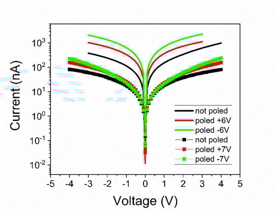 - The magnitude of the leakage current decreased significantly for the film grown from the pure target, statistically with more than one order of magnitude. Statistics performed on several electrodes, randomly selected, revealed that the leakage current, could have, sometimes, a significant dependence on the polarization state, more precisely on the polarization orientation, as presented in Figure 7. However, in most cases, the difference was small or absent. Statistically it was also observed that the current magnitude was larger after poling the samples compared to currents measured on not poled samples (as grown).