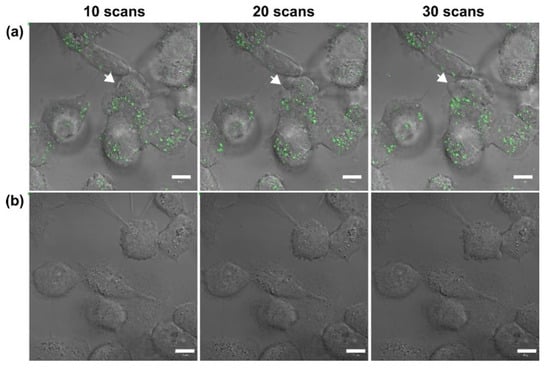 Bright-field images of (a) GNP-treated A431 cells irradiated by two-photon laser with 10, 20, and 30 scans, and (b) the control group (without GNPs). The green spots are the scattering expression from GNPs accumulated in vesicles through organelle fusion. Scale bar: 10 µm. The images of GNP-treated cells show the blebbing at cellular membranes.