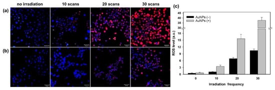 Fluorescence images of LSCM for ROS expression. Images of (a) A431 cells treated with GNPs irradiated by a two-photon laser with 10, 20, and 30 scans, and (b) the control group (cells not treated with GNPs). (c) Quantitative comparison of generated ROS of (a,b). Scale bar: 50 µm. The kit for detecting ROS is DCFDA (red fluorescence), and the kit for staining nuclei is Hoechst 33342 (blue fluorescence).