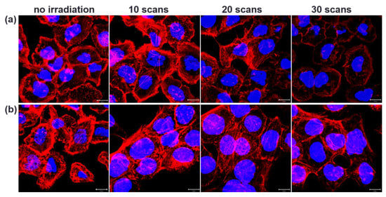 Fluorescence images of LSCM for cellular cytoskeleton. Images of (a) A431 cells treated with GNPs irradiated by two-photon laser with 10, 20, and 30 scans, and (b) the control group (cells not treated with GNPs). Texas Red-X phalloidin was used to label cytoskeletal F-actin (red), and Hoechst 33342 was used to stain nuclei (blue). Scale bar: 10 µm.