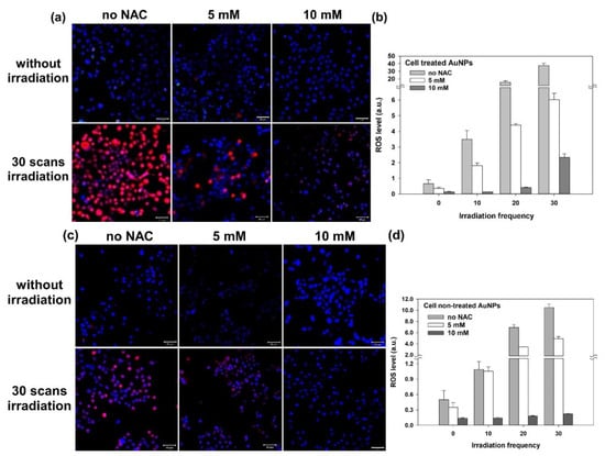To further clarify the relationship between biological effect and the dose of ROS generated from the two-photon excited GNPs, N-acetyl-L-cysteine (NAC), which is an inhibitor of ROS [,], was added to the cell medium for 1 h before laser irradiation.