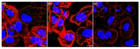 Fluorescence images of cellular cytoskeleton (LSCM) to show the inhibiting effect of NAC on ROS. Images of GNP-treated A431 cells treated with NAC of (a) 5 mM and (b) 10 mM irradiated by two-photon laser with 30 scans. (c) Image of GNP-treated A431 cells without NAC. Texas Red-X phalloidin was used to label cytoskeletal F-actin (red), and Hoechst 33342 was used to stain nuclei (blue). Scale bar: 10 µm.