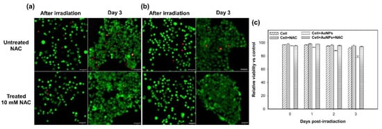 Fluorescence microscopy images of live (green)/dead (red) staining of A431 cells irradiated by two-photon laser after 3 days. Images of (a) GNP-treated cells with or without 10-mM NAC, and (b) the control group (not treated with GNPs) with or without 10-mM NAC. (c) The cell viability versus days of post-irradiation (0, 1, 2, 3).