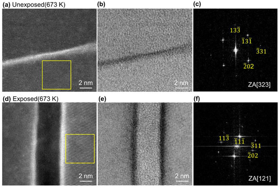 The results of further detailed observations of one arbitrary grain boundary of the Al grains are shown in Figure 4. The HAADF-STEM image of the unexposed Al compact in Figure 4a shows that this region is a grain boundary phase with the white contrast part (the region where Ga was accumulated). Lattice fringes can be more clearly seen from the ABF-STEM image (Figure 4b). Figure 4c shows a FFT image having a zone axis (ZA) of [323], obtained from the area surrounded by the yellow square in Figure 4a. From Figure 4a,b, it was found that there was almost no oxide layer at the grain boundary between the Al grains.