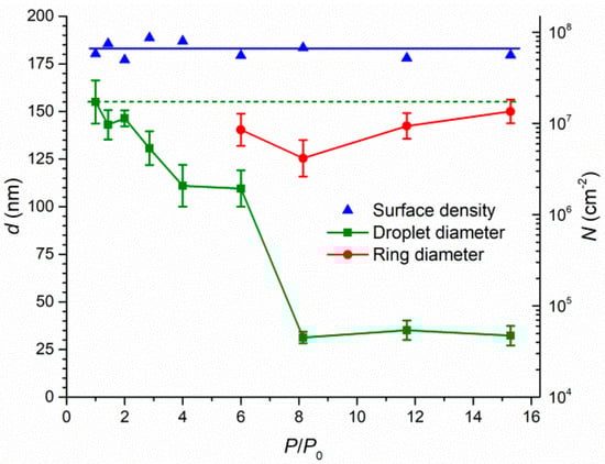 The mean standard deviation (indicated by caps in Figure 2) of the saturated diameter of droplets was found to be twice as much (4.4 nm) as for droplets exposed to lower arsenic fluxes (P/P0 = 6 and below; 8.8 nm on average). However, an increase in the arsenic flux does not lead to a monotonic change in the standard deviation of the droplet diameter until it reaches the saturation value (P/P0 = 8). The dispersion of ring diameters was observed to be at the level of the droplet size dispersion (7.7 nm) and tended to reduce with increasing arsenic flux. Discussing the results presented in Figure 2, it is also important to note that a small saturation size of nanostructures is achieved at a relatively high temperature without using a near-critical amount of deposited material, leading to the instability of formed droplets.