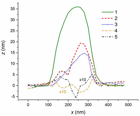 AFM profiles of nanostructures obtained after the deposition of 1.5 ML of indium and further exposure to the ultra-low arsenic flux: (1) P/P0 = 1; (2) P/P0 = 1.4; (3) P/P0 = 2; (4) P/P0 = 4; (5) P/P0 = 8.1.