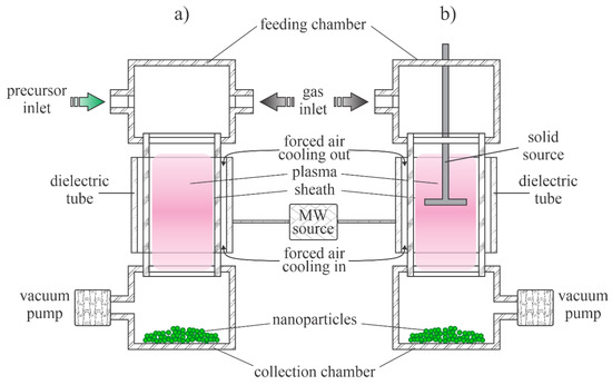 Schematic of the low-pressure microwave plasma system for nanoparticle synthesis: (a) with organometallic gaseous or powder precursor; (b) with solid precursor placed into the plasma reactor.
