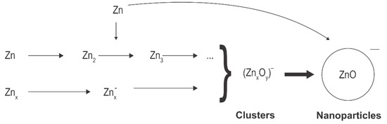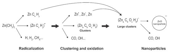 A schematic of plasma synthesis of ZnO nanoparticles using Zn-containing organic precursors is shown in Figure 2. The organometallic precursor forms radicals either by electron impact dissociation or quenching of Ar* metastables. The radicals are further split to form Zn atoms, which can also be excited or even ionized. Simultaneously, oxidation takes place, leading to the formation of molecules, such as OH, H2O, and CO, which are then associated with other atoms to form stable molecules (carbon dioxide and water). Radicals tend to associate with each other and form initial clusters. This effect was elaborated for other precursors (see the recent paper [41] and references therein). The initial small clusters adsorb radicals, and zinc atoms also condense on the surface, so the clusters grow. Simultaneously, they become negatively charged due to the attachment of slow plasma electrons. The negatively charged clusters attract positively charged species, causing further growth. Hydrogen and carbon, which are present in radicals and early stage clusters, readily interact with oxygen radicals (particularly O atoms that are in abundance in Ar-O2 plasma [39]) so almost pure ZnO is formed with a prolonged residence time. All surface reactions are exothermic. Hence, the cluster and nanoparticles’ temperature is well above the ambient temperature as long as they remain in plasma.