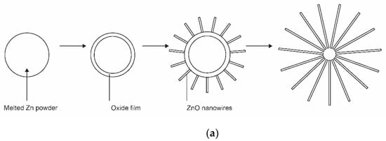 Schematic representation of the formation of nanoparticles with Zn powder as a precursor: (a) the formation of nanowires on the surface of metal powder; (b) the detail of the growth mechanism.