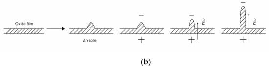The kinetics of ZnO nanoparticle formation using Zn powder as a precursor is different from that shown in Figure 2 or Figure 3. The interaction of oxygen-containing plasma with metallic substrates was elaborated long ago, and one of the first reports on the synthesis of large aspect ratio nanowires was published as [44]. The metallic powder heats up to a high temperature when exposed to rather powerful plasma. Therefore, the powder quickly melts and sometimes even evaporates if kept in a powerful plasma for too long. The oxidation of the melted powder can lead to a variety of morphological shapes [45], ranging from nanowires with very high aspect ratios to cauliflower-like structures. The formation of nanowires on the surface of metal powder is illustrated in Figure 4a. The detail of the growth mechanism is shown in Figure 4b. The surface of a thin oxide film is never perfectly smooth but rich in humps. The plasma electrons accumulate at the top of the humps due to the Faraday effect. This creates a static electric field along the hump. The Zn+ ions enter the oxide layer and preferentially move in the direction of the electric field, i.e., along the hump, until they reach the tip of the hump, where they oxidize, thus lengthening the hump. A longer hump leads to further accumulation of the negatively charged electrons at the tip and thus even more extensive electro-diffusion of positive ions towards the tip. Finally, a nanowire with a large aspect ratio is formed. This mechanism, as shown in Figure 4b, works only under specific conditions, especially temperature. If the temperature is too low to enable diffusion of Zn+ ions through the oxide layer and on through the hump, little oxidation takes place. When the temperature is too high, thermal diffusion predominates, electro-migration is not as efficient, and structures with poor aspect ratios are formed. In one work, the range of useful parameters for the growth of silica nanoneedles was found only between 1800 and 1850 K [38].