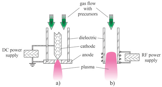 Direct current (DC) plasma arc (a) and radio frequency (RF) plasma torch (b).