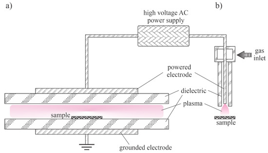 Schematic of a device useful for sustaining nonequilibrium plasma at atmospheric pressure. (a)—Plane parallel and (b)—jet configurations.