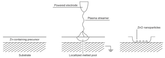 The low-frequency alternative current (AC) or pulsed DC discharges at atmospheric pressure are not able to sustain a homogeneous plasma as the lifetime of the reactive species at 1 bar is nearly 1 µs—much shorter than the duration of a low-frequency AC discharge, let alone a DC-pulsed discharge. Such discharges result in the formation of one or a few current pulses due to the formation of electron streamers. A bunch of such streamers is often called a filament. The density of charged particles in a streamer is usually greater than in a continuous low-pressure plasma (Figure 1). Therefore, for a short time, extensive surface chemistry takes place at a small spot on the material when it interacts with the streamer. These spots are locally heated to a high temperature, which is often sufficient to convert a continuous film of the deposited precursor to ZnO nanoparticles, despite the rather low average temperature of the substrate. Figure 7 illustrates the effect of a streamer on the substrate surface. Numerous streamers affect larger surface areas, but the nanoparticles may vary in morphology or even composition from spot to spot, depending on the intensity of each streamer. The nanoparticles can adhere well to the substrate as not all of the precursor needs to be oxidized.
