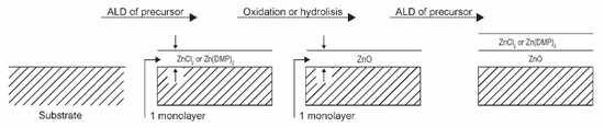 An advanced method for low-temperature oxidation of Zn-containing organic precursors is based on atomic layer deposition (ALD). This method is promising in microelectronics as only the surface atoms should chemically interact with the gas environment, so, at least theoretically, the oxidation could be carried out at room temperature. Mai et al. [27] reported the deposition of uniform, smooth, stoichiometric, and highly transparent ZnO films from organometallic precursors. They focused on bis-3-(N,N-dimethylamino)propyl zinc (II) ([Zn(DMP)2]). The authors used the plasma-assisted atomic layer deposition method under low-pressure conditions. The organometallic precursors were heated to an elevated temperature and condensed on silicon wafers in the form of a very thin film (about one monolayer). The deposition time was about 0.1 s. Oxygen was then injected into the experimental system, and the plasma was ignited, allowing reactive oxygen species to completely calcinate the extremely thin organometallic film. The plasma was powered with a capacitively coupled RF discharge at 13.56 MHz and nominal discharge power of 200 W. The oxygen was introduced into the chamber by pulses of 500 ms, in which the plasma was ignited for 150 ms. Such a treatment time was long enough for the calcination of the monolayer of the organometallic precursor. The process was repeated several times until a ZnO layer of thickness several 10 nm was formed on the substrate. Incomplete calcination was observed at shorter plasma treatment times, indicating the importance of plasma species on the calcination process. Films of good quality were observed even at substrate temperature as low as 60 °C. Therefore, this technique is suitable for the deposition of ZnO films on heat-sensitive objects due to the favourable calcination temperature. The chemical reactions between reactive oxygen species and the deposited thin layer of organometallics are apparently extensive enough to allow complete oxidation over a time scale of well below 1 s. However, the need for numerous repetitions of deposition and calcination phases may be a drawback. The procedure is shown schematically in Figure 8.